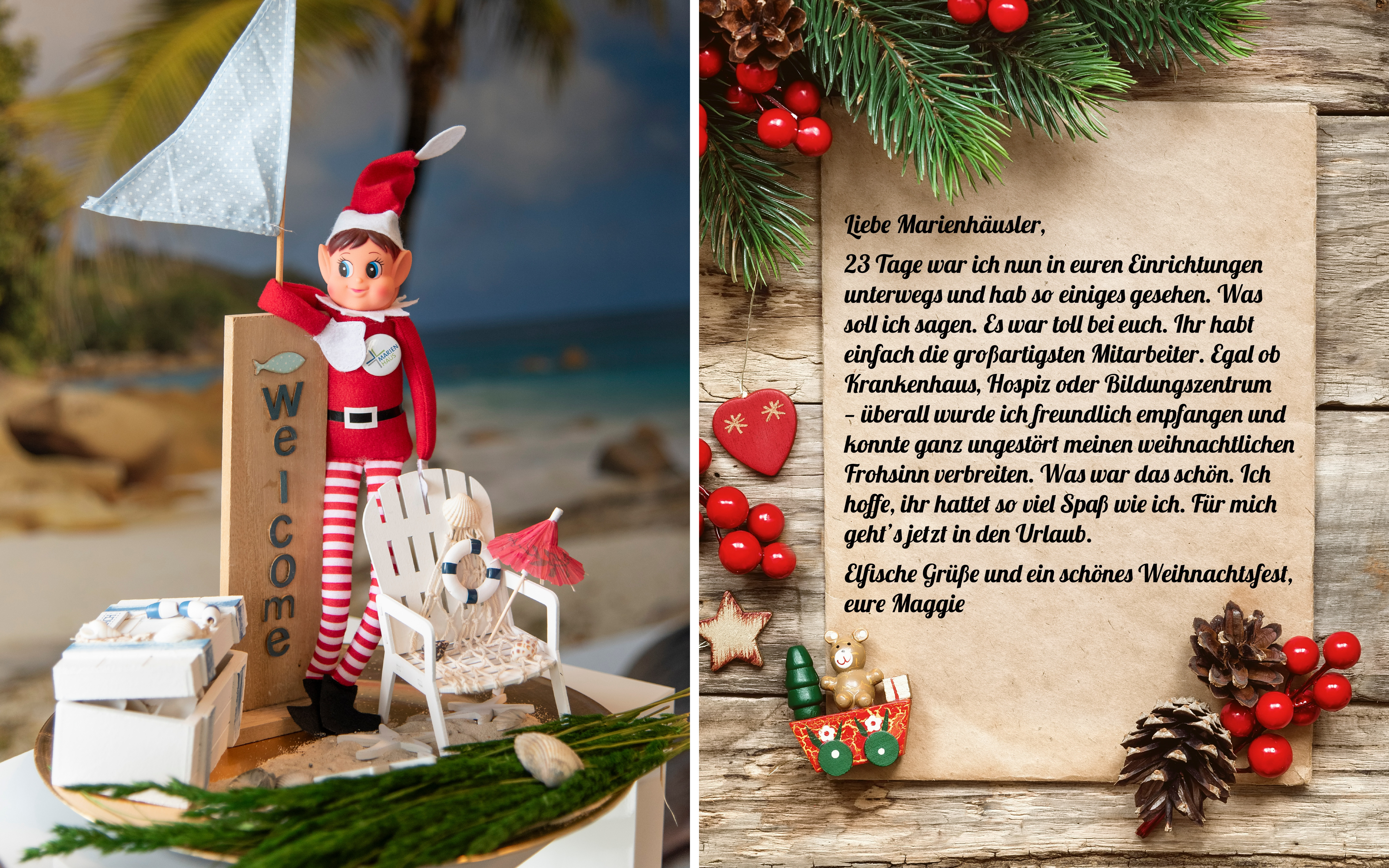 Liebe Marienhäusler, 23 Tage war ich nun in euren Einrichtungen unterwegs und hab so einiges gesehen. Was soll ich sagen. Es war toll bei euch. Ihr habt einfach die großartigsten Mitarbeiter. Egal ob Krankenhaus, Hospiz oder Krankenhaus - überall wurde ich freundlich empfangen und konnte ganz ungestört meinen weihnachtlichen Frohsinn verbreiten. Was war das schön. Ich hoffe, ihr hattet so viel Spaß wie ich. Für mich geht’s jetzt in den Urlaub. Elfische Grüße und ein schönes Weihnachtsfest, eure Maggie